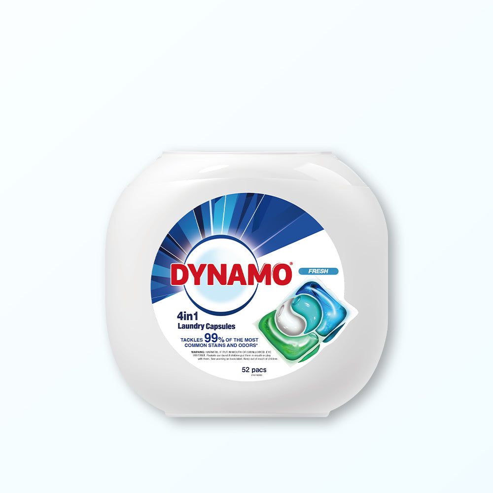 DYNAMO plant-based formulated laundry capsules dissolves easily in your wash, kills germs and removes common stains. Experience vibrant freshness and spotless results with each wash. Say goodbye to stains and hello to brilliantly clean and fresher-smelling clothes.
