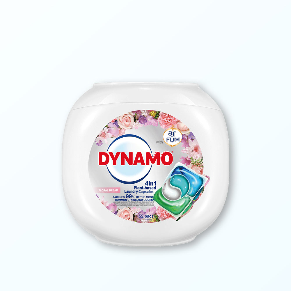 DYNAMO x ar FÜM plant-based formulated laundry capsules dissolve easily in your wash, kill germs, and remove 99% of common stains. Experience vibrant freshness and spotless results with each wash, thanks to ar FÜM’s signature fragrance technology. Say goodbye to stains and hello to brilliantly clean, fresher-smelling clothes.